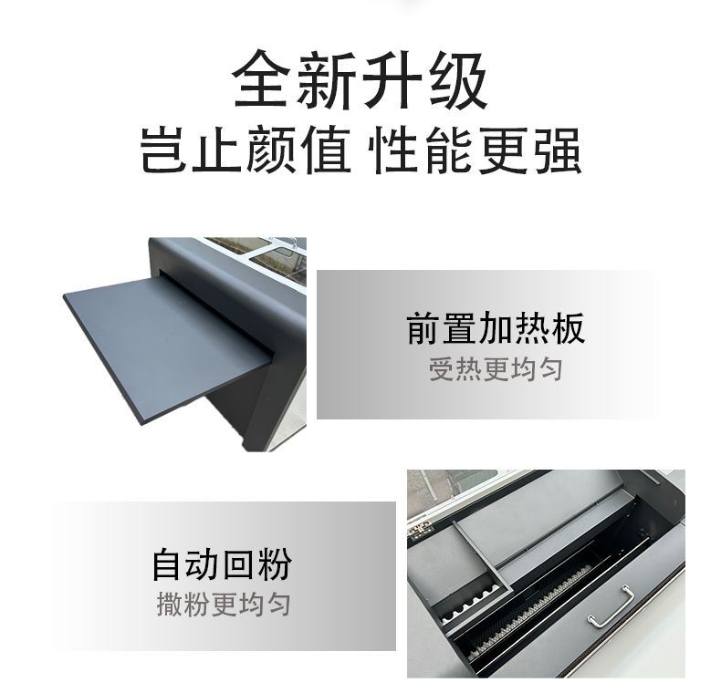 设备内置 自动循环回粉系统 与 双层热熔粉收纳箱,无需人工频繁倒粉,配合 粉量重力感应 技术,实现真正的智能化无人值守。平台采用 前后双吸风机 设计,紧紧吸附网带上的打印膜,确保传输平整不跑偏。加厚隔热机盖让表面温度始终保持在人体舒适的 37℃ 左右,结合 安全急停开关,为您的生产安全保驾护航。